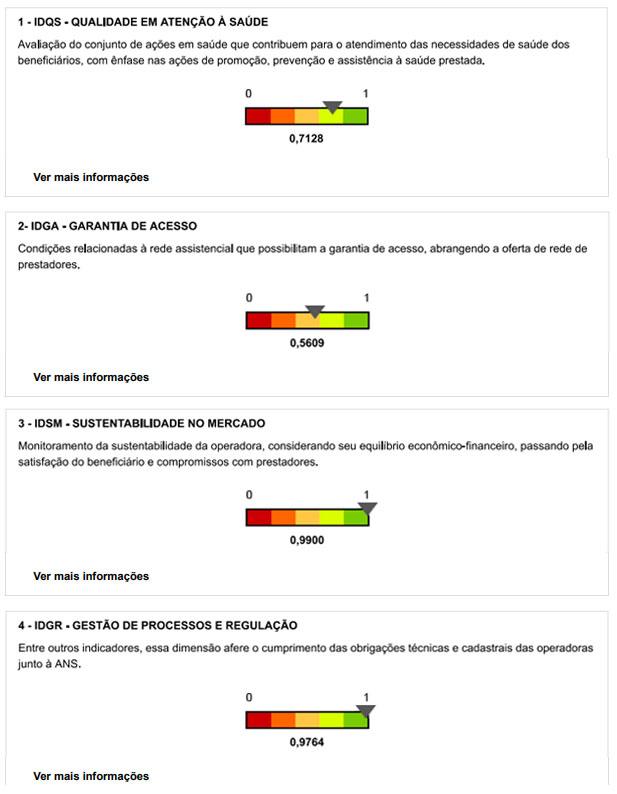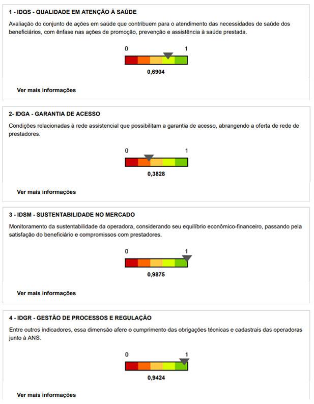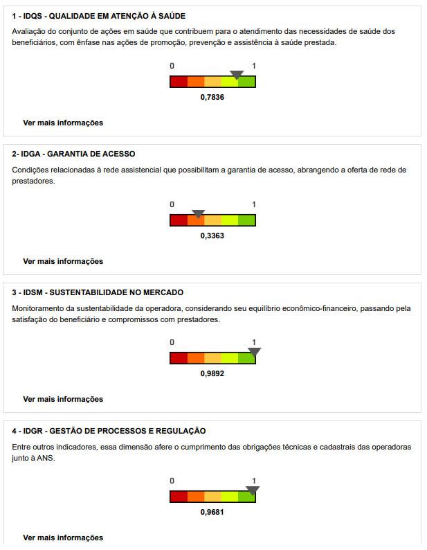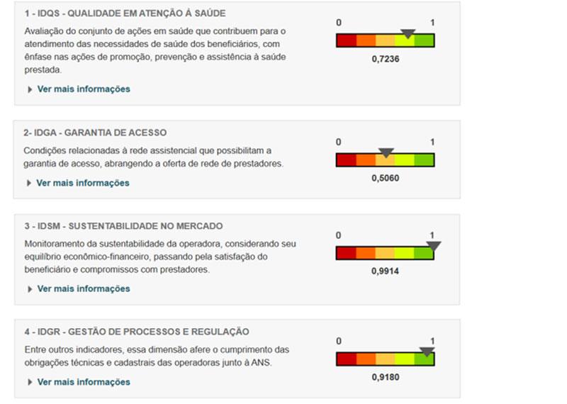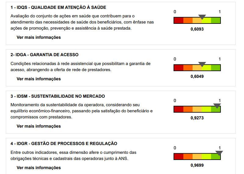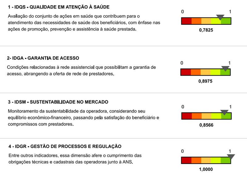Índice de Desempenho da Saúde Suplementar (IDSS), que varia de zero a um, tem como objetivo aferir o desempenho global das empresas, e é calculado a partir de indicadores definidos pela ANS distribuídos em quatro dimensões: Qualidade em Atenção à Saúde, Garantia de Acesso, Sustentabilidade no Mercado e Gestão de Processos e Regulação.